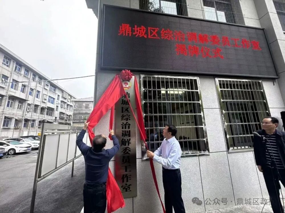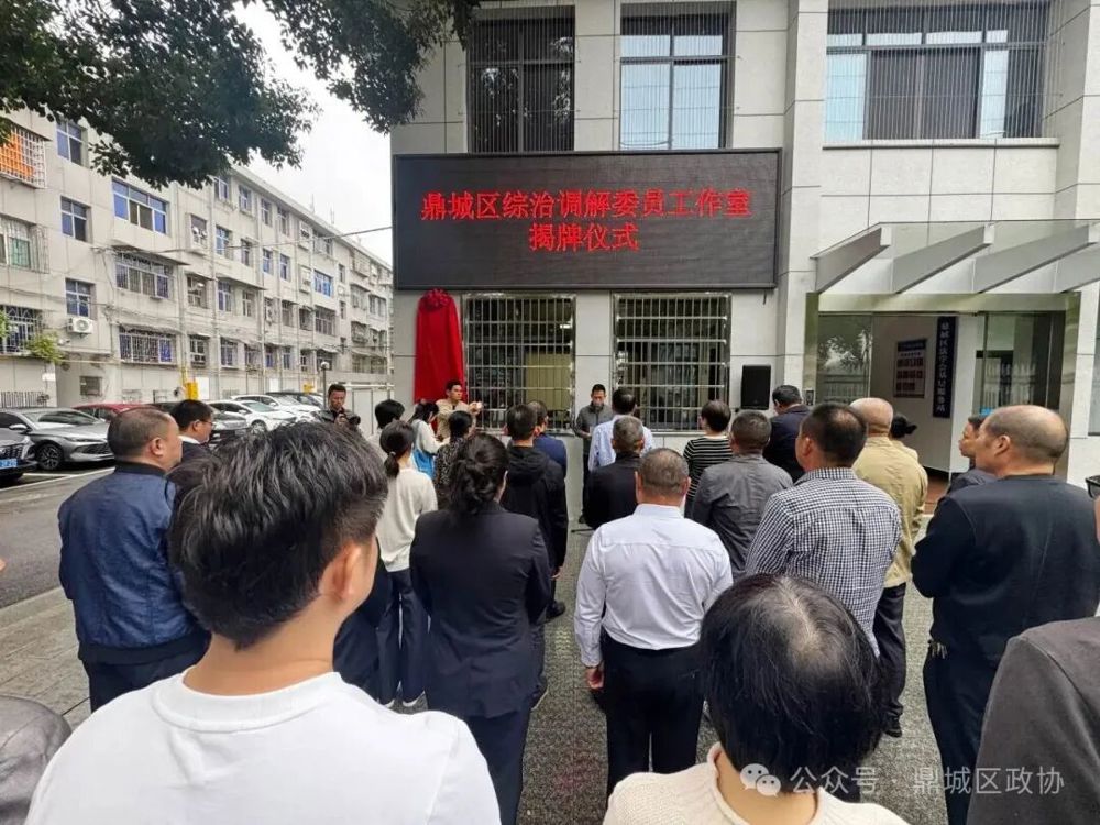 9月23日,鼎城区综治调解委员工作室揭牌仪式在综治中心举行。鼎城区政协主席雷建国,区委常委、区委政法委书记钟科程出席并共同为工作室揭牌。区政协副主席蒋利荣、胡小芳、雷绘玻、向兰,秘书长张静慧出席仪式。