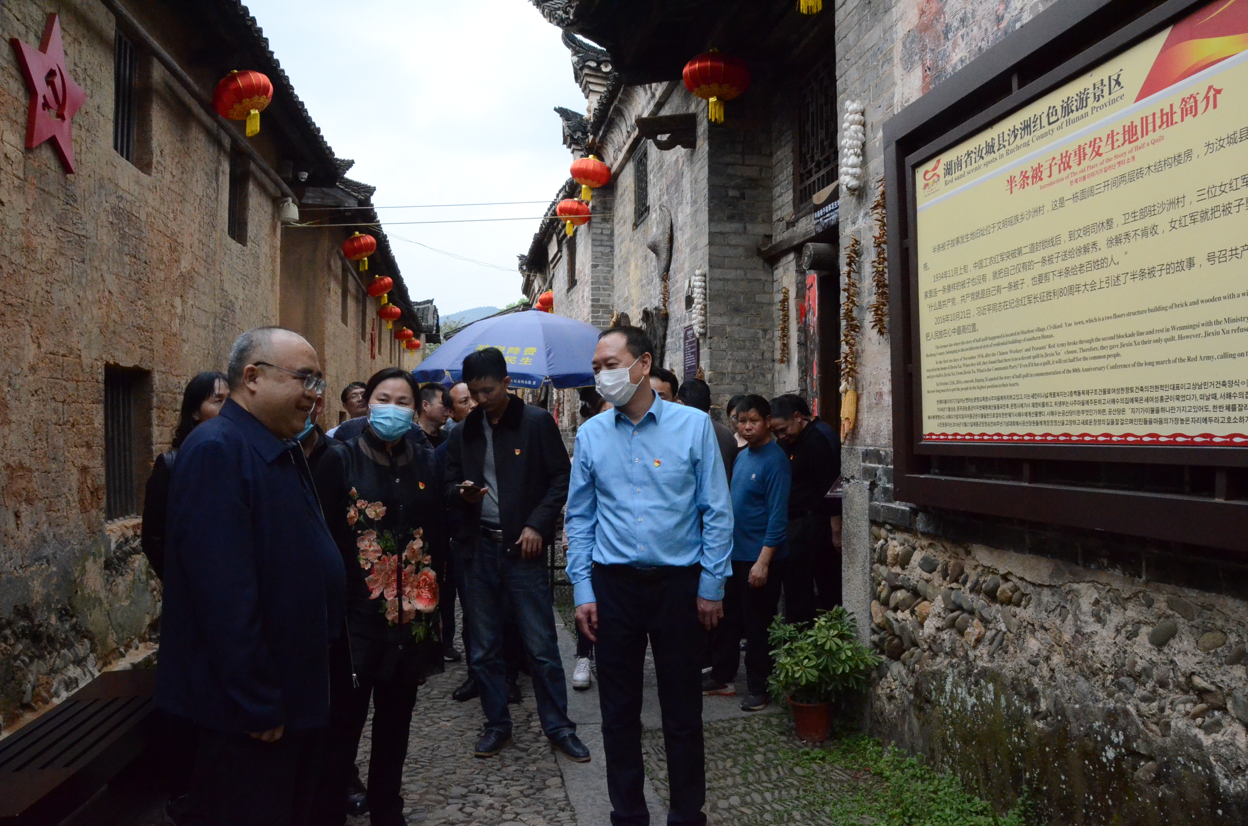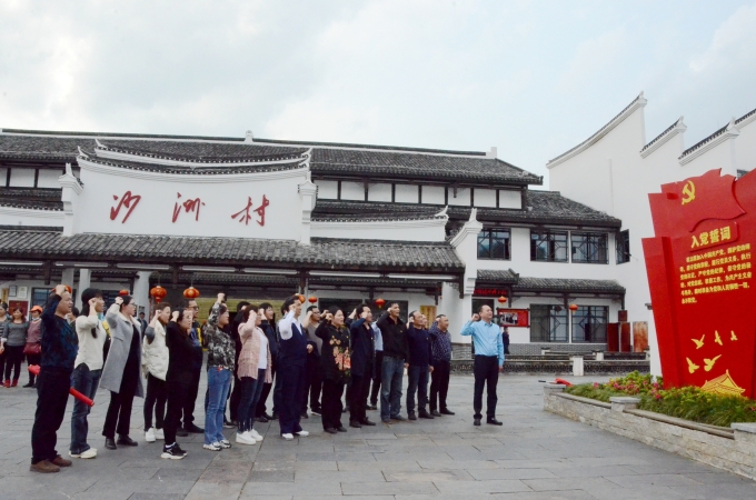 在汝城县沙洲村,在汝城县政协主席邱文辉的陪同下,政协机关党员干部先后参观了“半条被子”陈列馆、“半条被子”故事发生地旧址徐解秀老人故居、中国工农红军长征途经汝城时的总司令部、总卫生部等革命旧址,认真聆听了“半条被子”故事发生的始末,详细了解沙洲村的红色历史。随后在沙洲村广场前,面对庄严的党旗,大家怀着崇敬的心情静默肃立,庄严宣誓,重温了入党誓词。