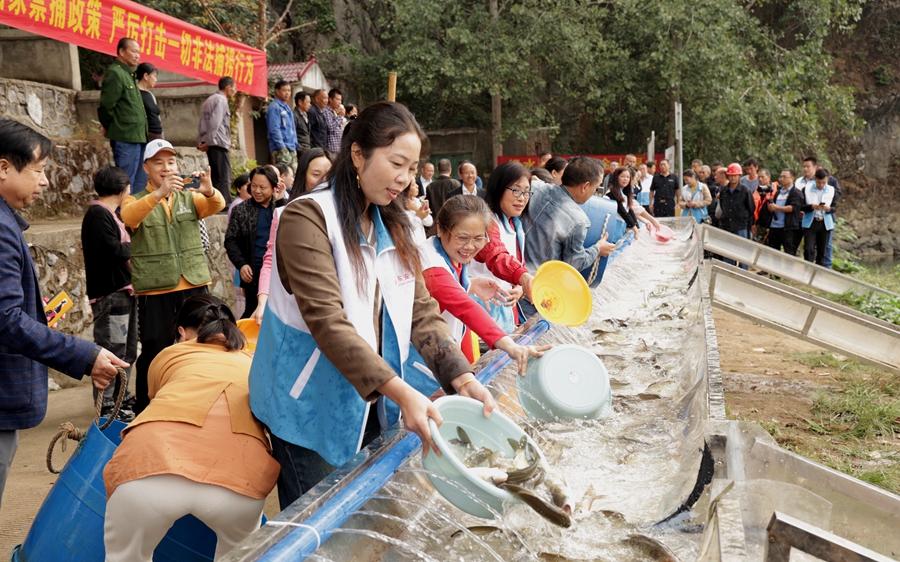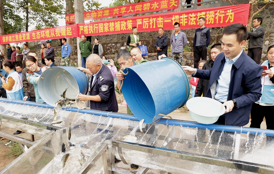此次活动共向湘江东安段紫水河水域投放草鱼、青鱼、鳙鱼、鲤鱼、鲢鱼等鱼苗2万余尾。活动现场,大家将将一盆盆、一桶桶活蹦乱跳的鱼苗倒进引流管道,随着阵阵水花溅起,鱼儿顺着水流快速游入河中,为湘江东安段水域补充了渔业资源,丰富水生生物多样性,增添了水域生机与活力,营造全社会养护水生生物和保护水域生态环境的良好氛围。