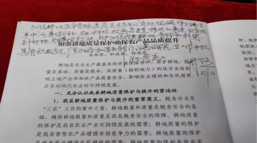 农林界、科技界、特邀界委员在“加强耕地质量保护确保农产品品质提升”中分析了当前我县耕地质量现状,建议树立耕地质量保护意识,加强保护队伍建设,实施测土配方,恢复绿肥种植技术,推广新型环保病虫害防控技术,推动高标准农田建设等方面推动耕地质量保护。周立夫批示“加强耕地质量管理,是落实习总书记要把饭碗牢牢端在手中的具体行动,农业、科技、特邀界委员提出的意见,现实性、针对性、前瞻性较强,对加强我县耕地管理和利用具有积极意义,请政府和有关部门认真研究在工作中抓好落实。