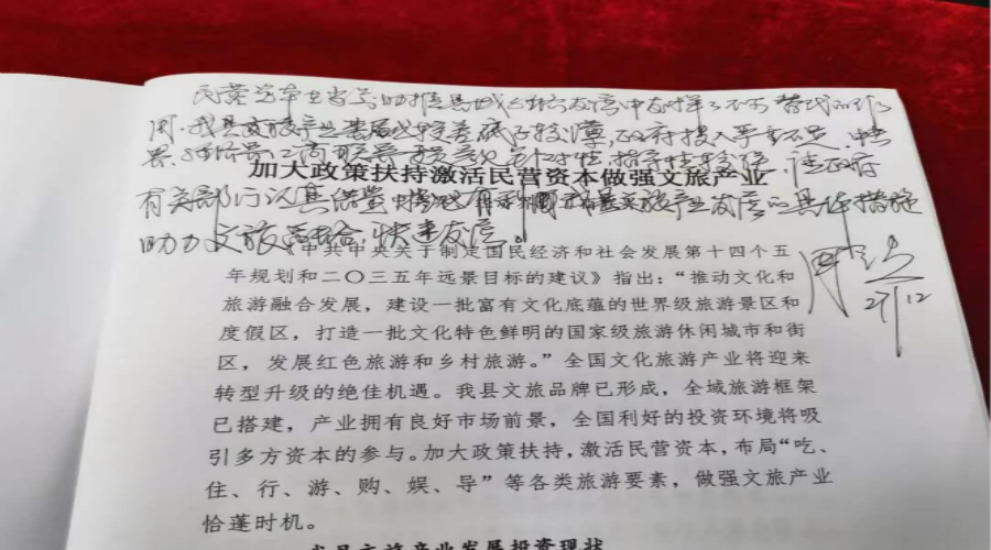 中共界、经济界、工商联界委员在“加大政策支持激活民营资本做强文旅产业”中分析了我县当前文旅产业发展现状和面临的不足,提出了在顶层设计、创新机制、引入市场主体、强链补链上下功夫等建议。周立夫批示“民营资本在当前助推县域经济发展中发挥了不可替代的作用,我县文旅产业基础较差,底子较薄,政府投入严重不足,中共界、经济界、工商联界委员意见针对性、指导性较强,请政府有关部门认真借鉴,提出有利我县文旅产业发展的具体措施,助力文旅融合快速发展”。