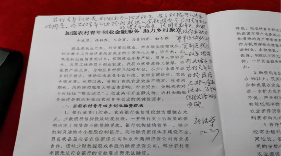 少民界、社科界、工会界、共青团界、妇女界委员在“加强农村青年创业金融服务 助力乡村振兴”中建议政府要以政策扶持为引导,建立考核机制,出台相关政策,激励金融机构加大对创业青年金融扶持的积极性,为青年返乡创业就业搭建绿色通道。唐德荣批示“农村青年创业是县域经济的活力所在,是乡村振兴的决定性因素,为农村青年创业提供精准的金融服务,是农村青年创业的堵点和痛点,请团县委牵头、妇联和县政府金融办等单位协助研究制定精准的政策措施,打通堵点,为农村青年创业提供源源不断的金融活水,为县域经济的发展做出贡献”。