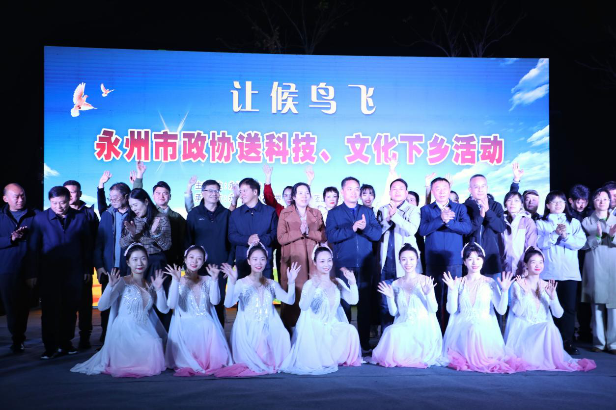 产业调研甫一结束,一场精心筹备的“让候鸟飞”科技文化盛宴便在夕阳下的上洞村活动中心广场拉开帷幕。当天晚间,市政协联合蓝山县政协等多个单位和部门为当地乡亲们带来了农业技术、候鸟保护科普展览和一场精彩纷呈的文艺汇演。