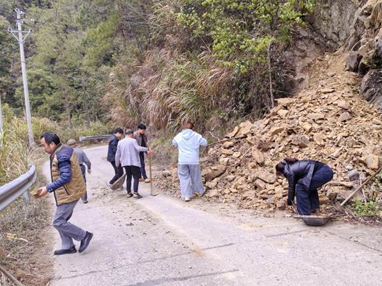 “沙落村路段又发现塌方!”4月1日,蓝山县政协荆竹瑶族乡委员工作室接到群众反映,迅速组织带领镇村干部赶赴县道X081沙落村段山崖塌方现场,及时设置安全警示标识,清理落石和树木,保障群众通行安全。