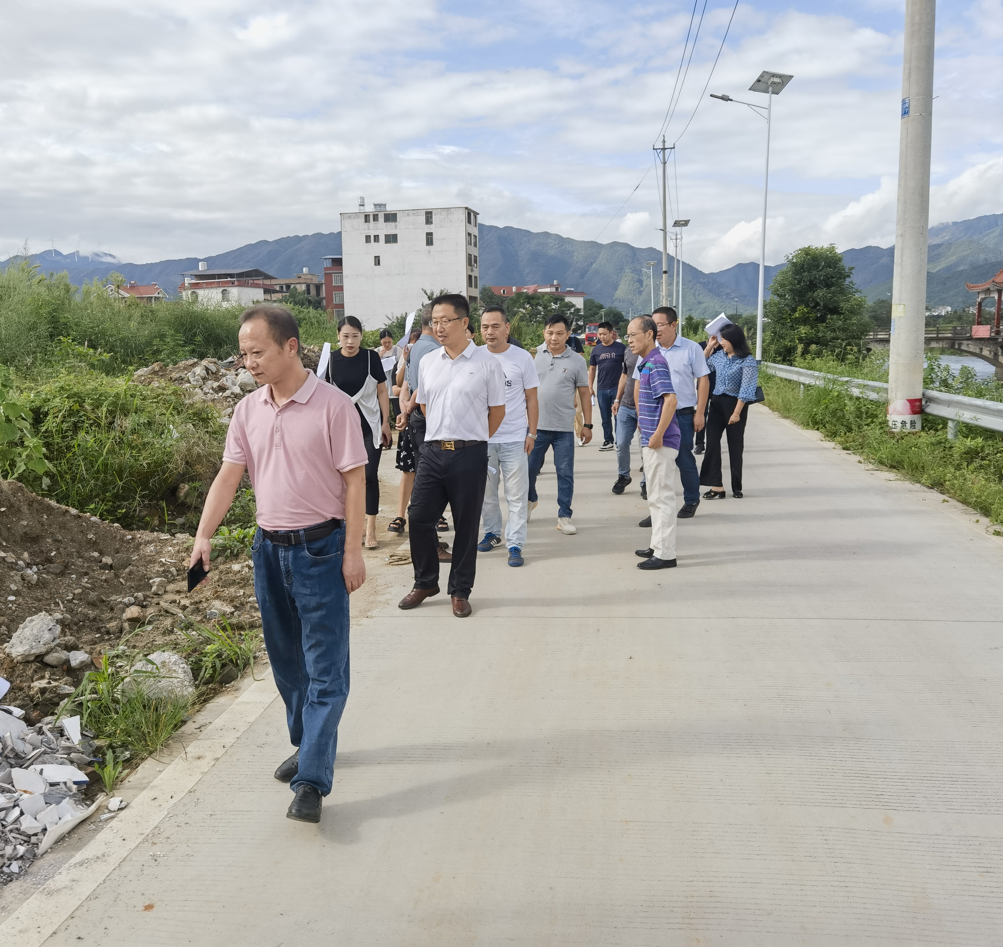 在舜水河沿岸,蒋吉辉一行沿河踏察,详细了解塔下寺河正对面违规倾倒建筑垃圾情况、舜水河边养鸭场污染环境等重点监督整治情况;在湘粤北路蓝山县城乡生活垃圾收运一体化垃圾转运站工程建设现场,蒋吉辉与相关负责人亲切交谈,详细了解项目建设进度、垃圾废物收运处理等情况。