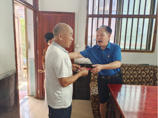“感谢你们的关心……”“共产党员好,共产党员真是好啊……”,梧村的老党员们握着走访人的手激动的说到,这是新田县政协机关离退休党支部走访慰问时发生的一幕幕场景。2022年6月24日,县政协机关离退休党支部为做好庆祝建党101周年系列活动,凝聚团结奋进力量,进一步激发党员干部身份上的荣誉感、工作上的成就感、生活上的获得感,组织支部党员们前往新圩梧村开展走访慰问50年以上党龄老党员和困难老党员关怀帮扶活动。