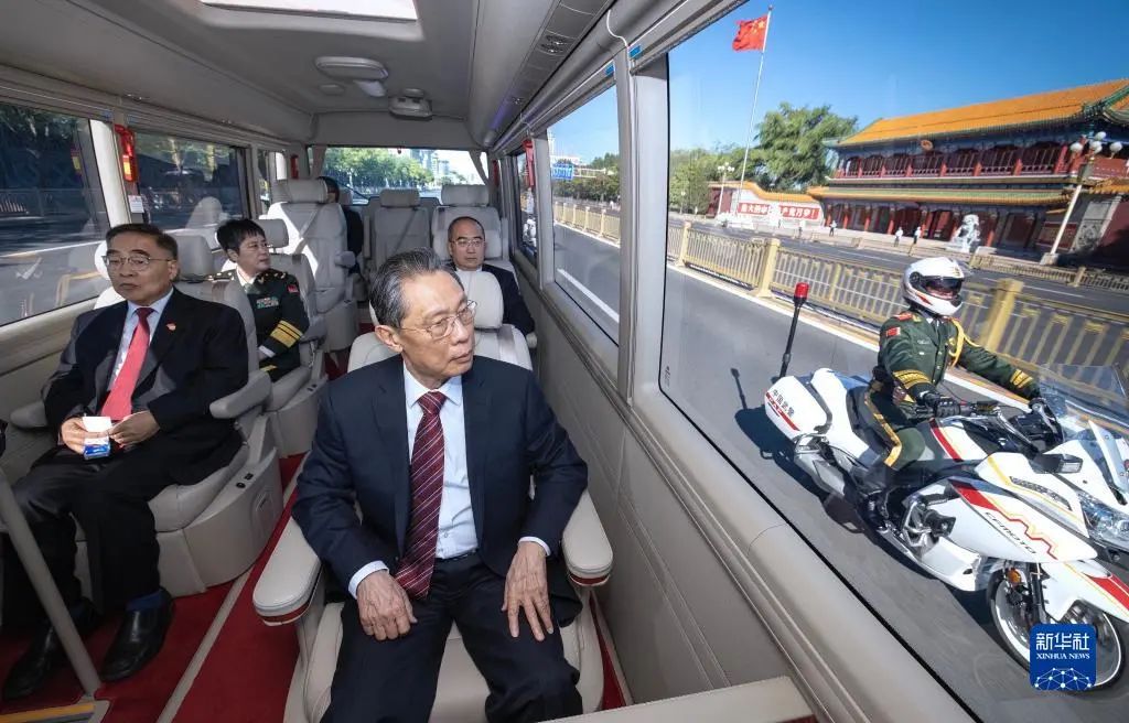 在21辆摩托车组成的礼宾摩托车队护卫下,“共和国勋章”获得者钟南山和“人民英雄”国家荣誉称号获得者张伯礼、张定宇、陈薇,一同乘坐礼宾车从京西宾馆出发,前往人民大会堂。沿街站立的公安民警向车队庄严致礼,行人们也纷纷投去崇敬的目光。