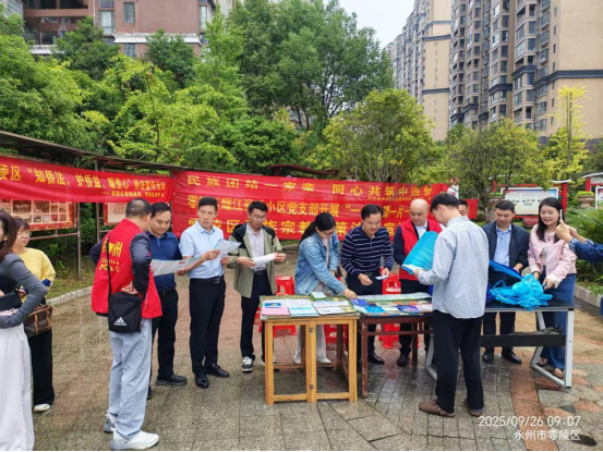 为深入宣传党的民族宗教政策法规,进一步促进民族团结、宗教和睦、社会和谐,9月26日,零陵区政协宗教界社会救济福利界委员工作室委员走进耀江豪廷小区,开展以“铸牢中华民族共同体意识,坚持我国宗教中国化方向”为主题的委员活动日活动,将政策法规送到居民身边。