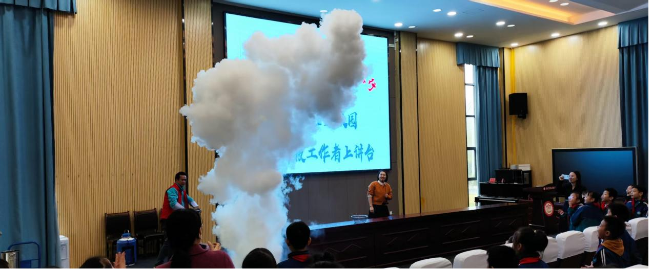 神奇科学魔法秀惊艳登场。“水火相容”表演中,科普老师巧妙操控实验装置,让火焰在水中稳定燃烧,原本看似对立的两种物质和谐共存,颠覆了同学们的固有认知;“掌中火焰”让大家屏住呼吸,老师手掌托起熊熊火焰,却安然无恙;当液氮被缓缓倒入容器,瞬间升腾起巨大的白色“液氮蘑菇云”。同学们纷纷惊呼“太神奇了”。老师边演示边细致讲解实验原理,孩子们在震撼体验中深化对科学的认知。